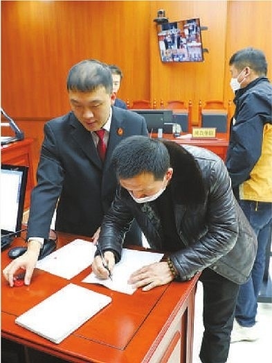 二審宣判后,農民工代表簽字領取被拖欠的工資。