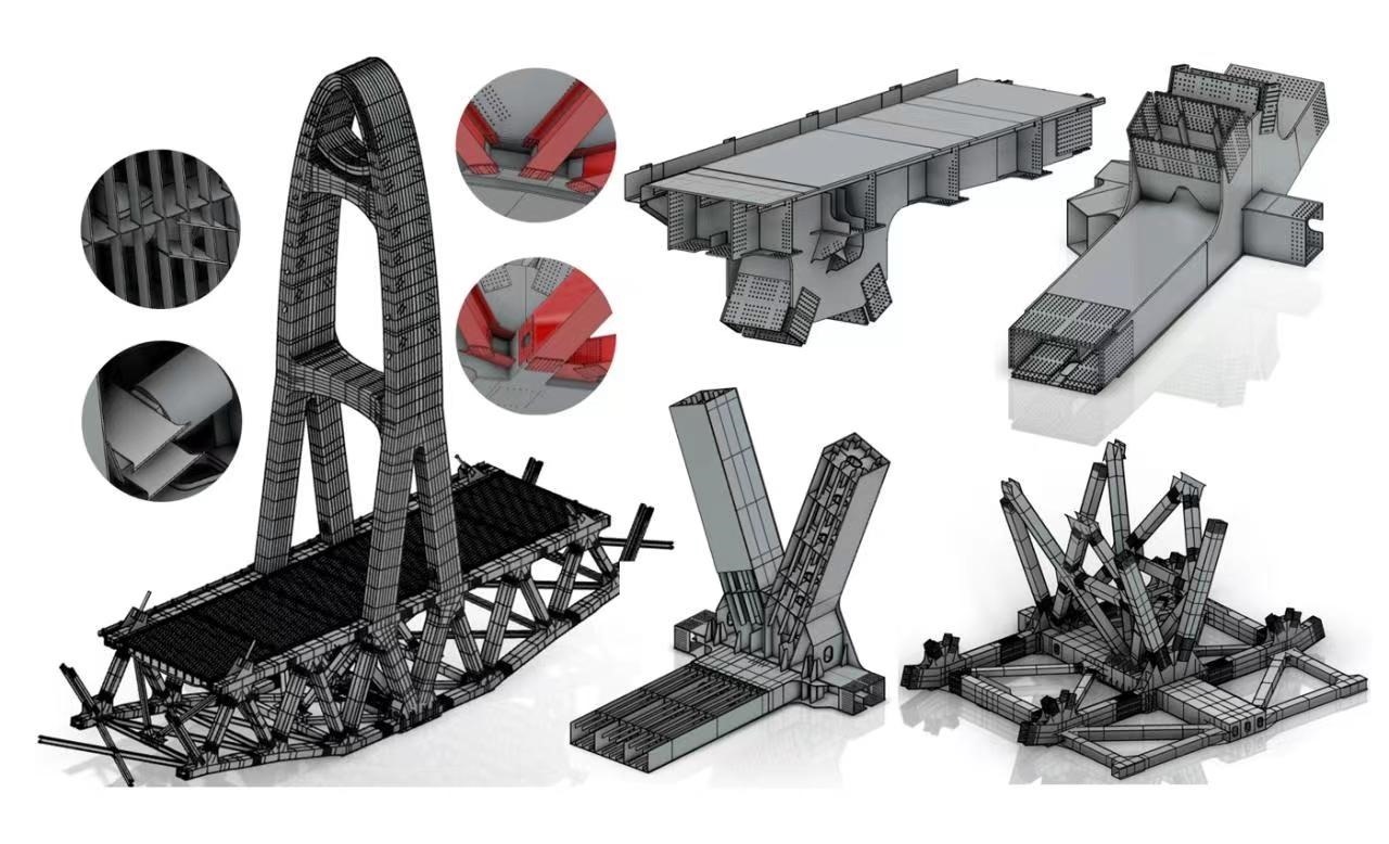 “本橋曲線鋼桁梁構(gòu)造異常復(fù)雜,鋼塔外形為半橢圓變截面,桁架近萬根桿件空間定位要求嚴(yán)絲合縫。為了準(zhǔn)確表達(dá)每個(gè)細(xì)節(jié),我們采用了BIM正向設(shè)計(jì)思路,探索出設(shè)計(jì)—建?!蓤D一體化的設(shè)計(jì)流程,開發(fā)出自動(dòng)化建模功能和智能化出圖系統(tǒng),為施工企業(yè)和鋼梁制造廠提供高精度的模型和批量圖紙,精準(zhǔn)表達(dá)復(fù)雜的結(jié)構(gòu)信息和設(shè)計(jì)意圖,打通了設(shè)計(jì)—制造—施工全過程信息傳遞路徑,有效節(jié)約了工期與造價(jià)。”中鐵設(shè)計(jì)集團(tuán)大橋項(xiàng)目主管總工彭嵐平向我們講述了大橋采用的最新智能化設(shè)計(jì)手段。