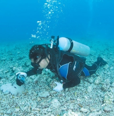 海南南海熱帶海洋研究所所長陳宏在珊瑚移植前進(jìn)行海底環(huán)境調(diào)查。 于志龍攝