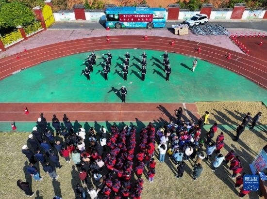 12月1日,在長沙市望城區(qū)新河學(xué)校,學(xué)生觀看交警手勢演示(無人機照片)。