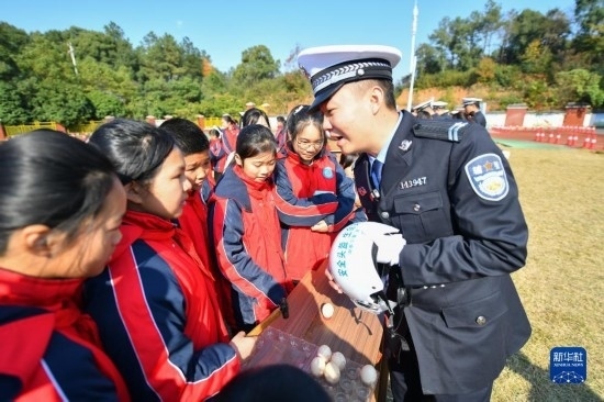 當(dāng)日,長沙市公安局望城分局交警大隊的民警走進農(nóng)村地區(qū)學(xué)校,通過交警手勢演示、鐵騎技能展示、交通標(biāo)識競答、頭盔碰撞模擬體驗、汽車盲區(qū)體驗等多種形式,開展道路交通安全宣傳活動,幫助學(xué)生們提高交通安全意識。