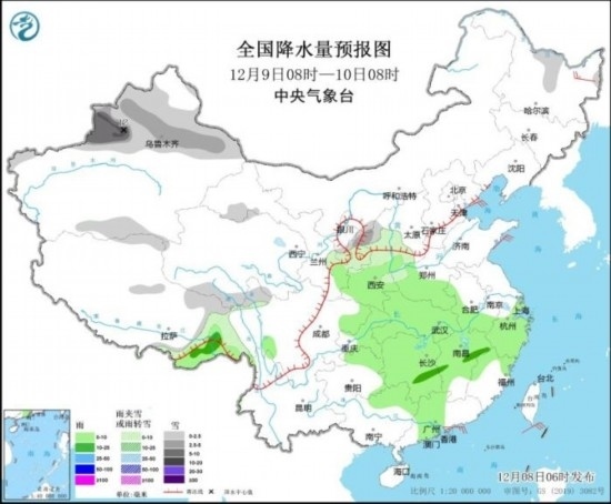 12月9日08時至10日08時,新疆北疆和南疆盆地南部、西藏北部和東部、青海南部、甘肅西部、寧夏東部、陜西西北部、黑龍江北部等地部分地區(qū)有小到中雪或雨夾雪,其中,新疆沿天山地區(qū)和伊犁河谷、陜西北部等地部分地區(qū)有中到大雪,新疆伊犁河谷等地局地暴雪(10~12毫米)。西藏東南部、陜西中南部、黃淮西部、江淮西部、江漢、江南大部、西南地區(qū)東部、華南北部等地部分地區(qū)有小雨,局地中雨。黑龍江東北部部分地區(qū)有4~6級風(fēng)。