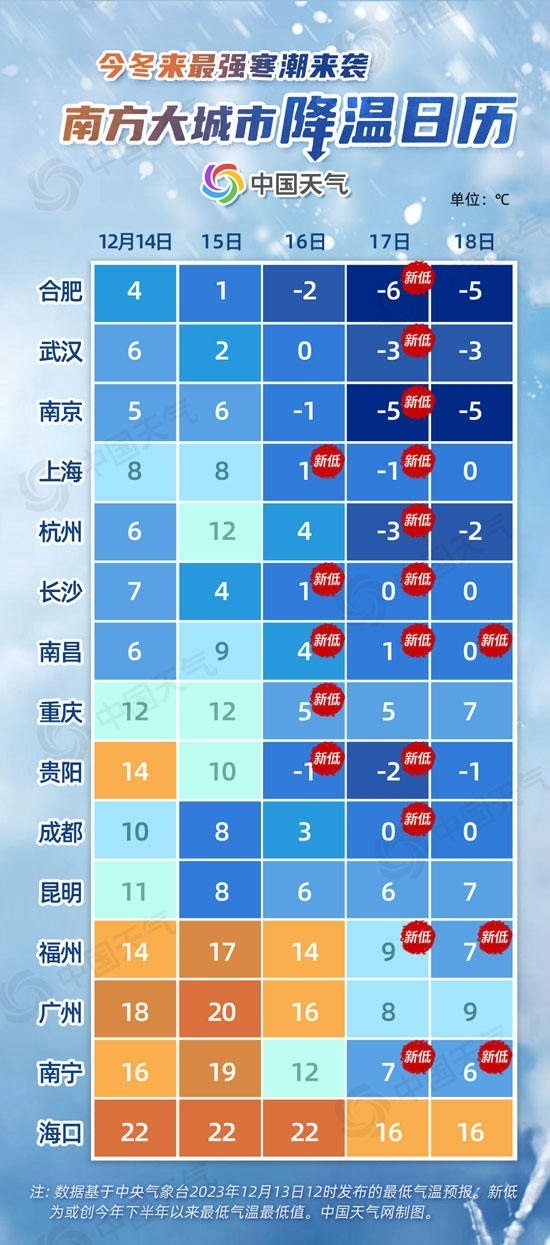從中國天氣網(wǎng)推出的南方大城市降溫日歷來看,未來五天,合肥、武漢、南京、上海、杭州、貴陽最低氣溫都將逐步下降到冰點(diǎn)以下。南昌16日至18日最低氣溫或連創(chuàng)新低,貴陽最低氣溫將從14℃降至-2℃,降幅可達(dá)16℃。