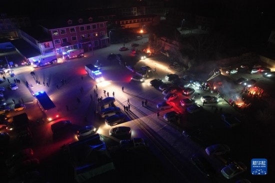 12月19日,在甘肅省臨夏回族自治州積石山保安族東鄉(xiāng)族撒拉族自治縣大河家鎮(zhèn)大河村,多方力量開(kāi)展救援(無(wú)人機(jī)照片)。