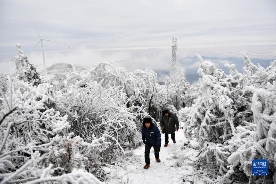 12月19日,尹斌(右)和龍昱君在110千伏西公線(xiàn)003號(hào)監(jiān)測(cè)哨所觀測(cè)鐵塔覆冰情況后返回。