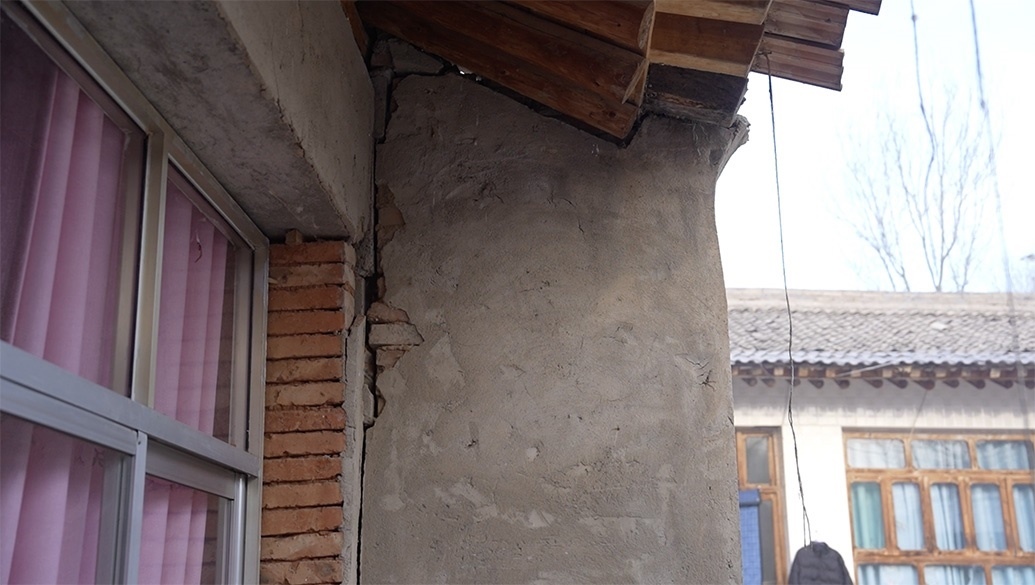 12月23日當(dāng)天,馬國忠和叔叔伯伯兩家都在家門前搭起剛領(lǐng)的帳篷。叔叔馬進(jìn)明家受損嚴(yán)重,兩堵磚墻的銜接處完全開裂,像條拉鏈被猛地拽下;天花板掉了大半,木頭架構(gòu)的屋頂赫然露在豁口里。所幸,他和家人平時在縣城租房住。