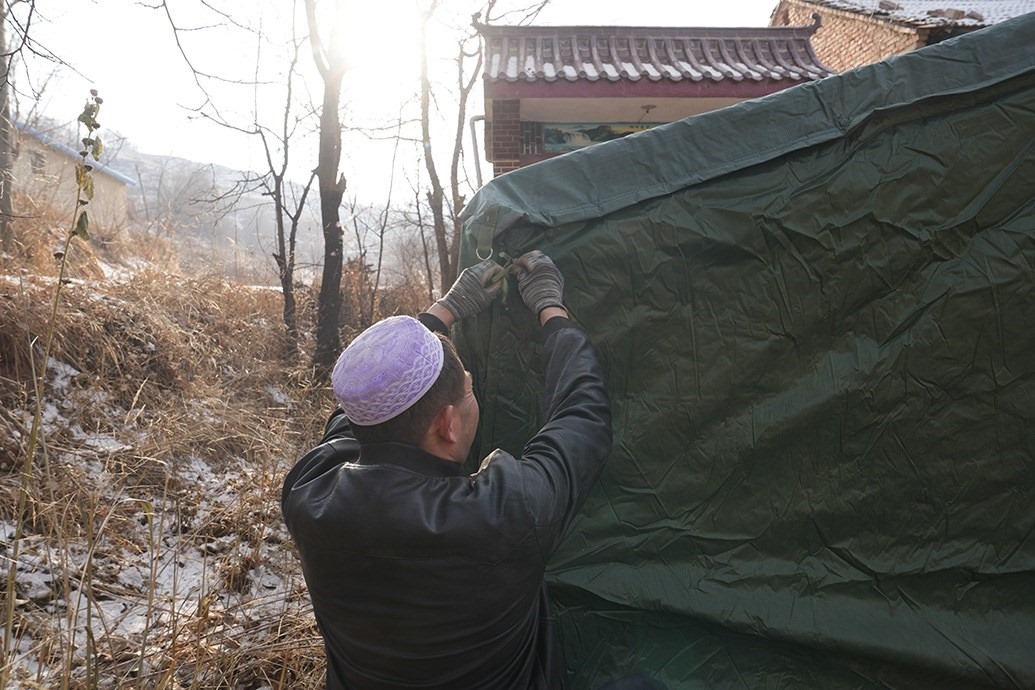 馬國忠的叔叔在家門口搭帳篷。
