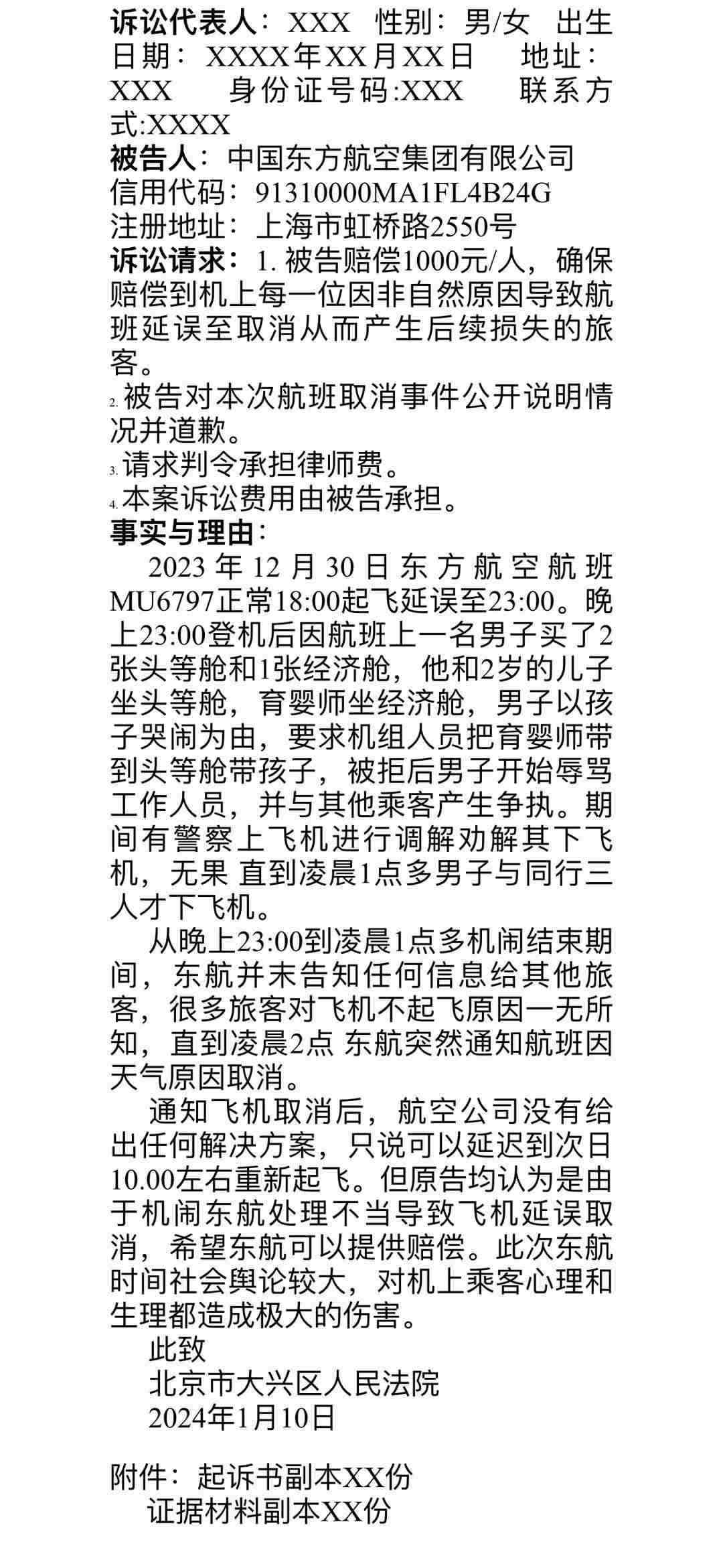 群內(nèi)發(fā)出的起訴書寫道:“從當(dāng)日23點(diǎn)到次日凌晨1點(diǎn)多機(jī)鬧結(jié)束期間,東航并未告知任何信息給其他旅客,很多旅客對(duì)飛機(jī)不起飛原因一無所知,直到凌晨2點(diǎn),東航突然通知航班因天氣原因取消。通知飛機(jī)取消后,航空公司沒有給出任何解決方案,只說可以延遲到次日10點(diǎn)左右重新起飛。但原告均認(rèn)為是由于機(jī)鬧,東航處理不當(dāng),導(dǎo)致飛機(jī)延誤取消,希望東航可以提供賠償。此次東航事件社會(huì)輿論較大,對(duì)機(jī)上乘客心理和生理都造成極大的傷害?!睋?jù)悉,乘客們擬起訴至北京市大興區(qū)人民法院。
