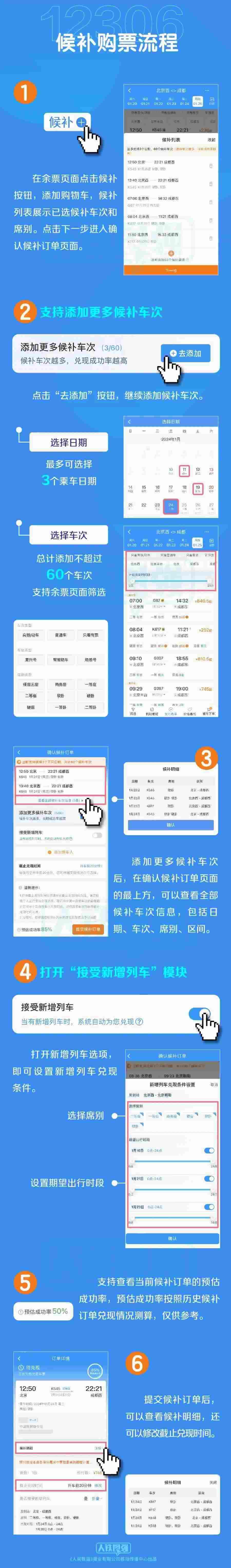 為提升旅客購票體驗,鐵路部門加大研發(fā)力度,對鐵路12306候補購票功能進行了優(yōu)化升級。一是增加候補訂單數(shù)量。每名旅客可提交的待兌現(xiàn)候補訂單數(shù)量由2個增至6個,每個訂單最多可添加9名乘車人。二是增加備選方案數(shù)量。原來旅客提交候補訂單時,可選擇相鄰2個乘車日期、每個日期可選擇5個“車次+席別”的組合,最多可選擇10個組合。優(yōu)化升級后,旅客可選擇預(yù)售期內(nèi)任意3個乘車日期,累計最多可選擇60個“日期+車次”的組合,每個車次可選多個席別。三是擴大候補訂單兌現(xiàn)時間選擇范圍。原來候補訂單截止兌現(xiàn)時間最晚為開車前2小時,優(yōu)化升級后調(diào)整為開車前20分鐘,旅客可在更大范圍內(nèi)根據(jù)實際情況自主選擇修改截止兌現(xiàn)時間。四是臨時新增旅客列車席位優(yōu)先配售給已提交候補訂單的旅客。旅客在提交候補訂單時,可選擇接受購買符合出行需求的新增旅客列車車票,如鐵路部門臨時新增旅客列車,在車票起售時,鐵路12306將自動優(yōu)先配售給已提交候補訂單的旅客,旅客無需人工查詢增開列車信息再購票。