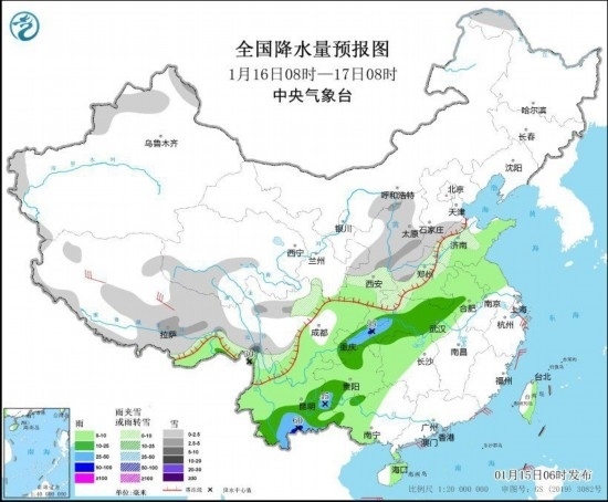 圖1 全國降水量預(yù)報(bào)圖(1月15日08時-16日08時)