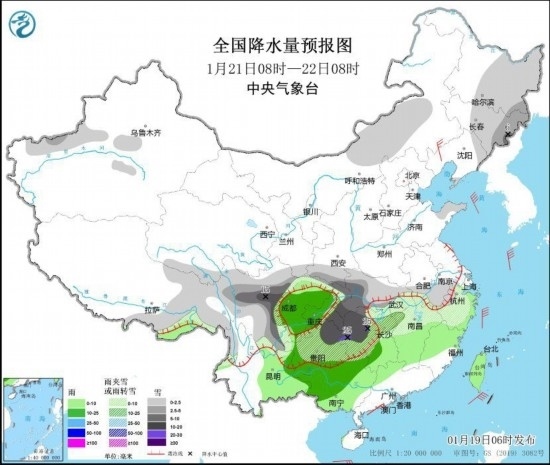 中新網(wǎng)1月19日電 據(jù)中央氣象臺網(wǎng)站消息,昨日內(nèi)蒙古、陜西、河南等地出現(xiàn)小到中雪或雨夾雪,湖南、湖北、江西等地部分地區(qū)出現(xiàn)明顯降雨。19日,內(nèi)蒙古等地有雨雪天氣,廣西、湖南、江西等地有明顯降雨,防范對交通運輸?shù)鹊挠绊懀?0日起寒潮影響我國中東部,關(guān)注大風(fēng)降溫和雨雪天氣對交通運輸、城市運行和農(nóng)業(yè)生產(chǎn)等的影響。