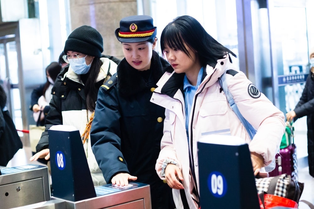 北京西站客運員協(xié)助旅客檢票進(jìn)站。新華社發(fā)(徐強攝)