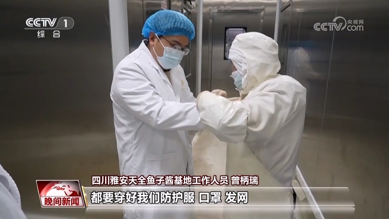 四川雅安天全魚子醬基地工作人員 曾柄瑞:每次進加工車間都要穿好防護服、口罩、發(fā)網(wǎng),就像進手術(shù)室一樣,經(jīng)過非常嚴(yán)格的消毒程序和控制,才能夠進入加工車間。
