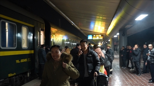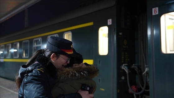 14號(hào)車廂內(nèi),來自黑龍江省齊齊哈爾市泰來縣的王興海和陳玉倩望著車窗外、站臺(tái)上的王靚怡,喜笑顏開??缭?700多公里、歷時(shí)52個(gè)小時(shí),只為給女兒一個(gè)驚喜,陪她在崗過年。