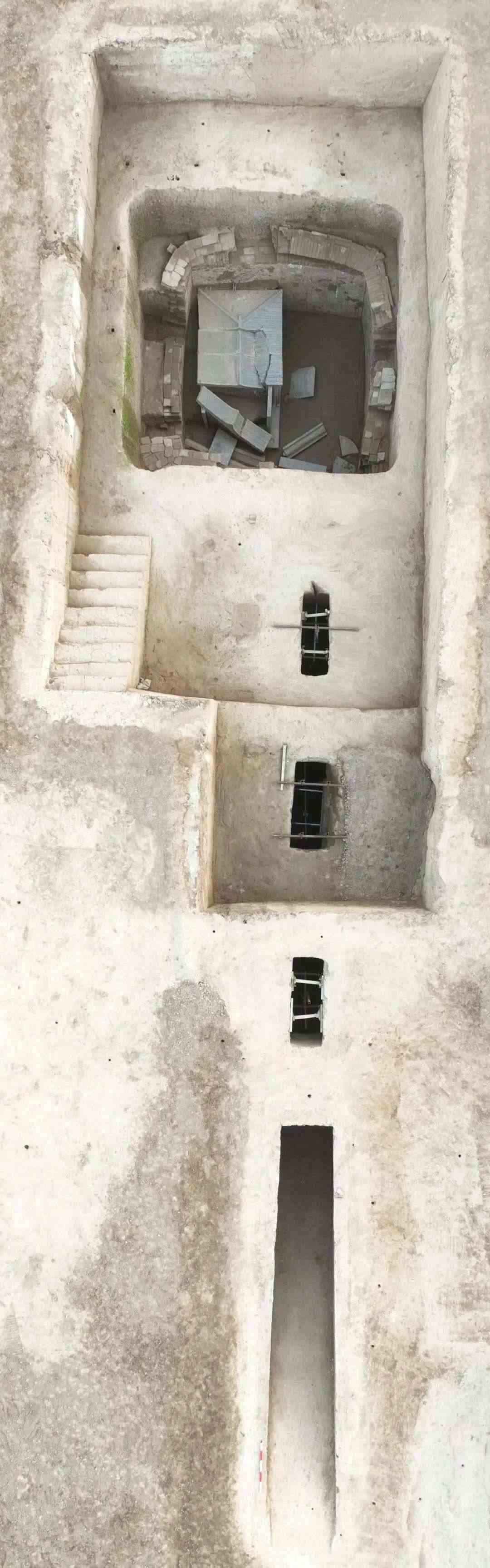 該墓為斜坡墓道三天井單室磚室墓,遭嚴(yán)重盜擾,石門,墓室頂部等均被破壞,墓室內(nèi)各類器物已被盜掘一空,僅發(fā)現(xiàn)有少量陶器殘片。墓道兩側(cè)各分布有兩個壁龕,壁龕內(nèi)殘存陶雞、陶狗、陶駱駝等動物俑七十余件。