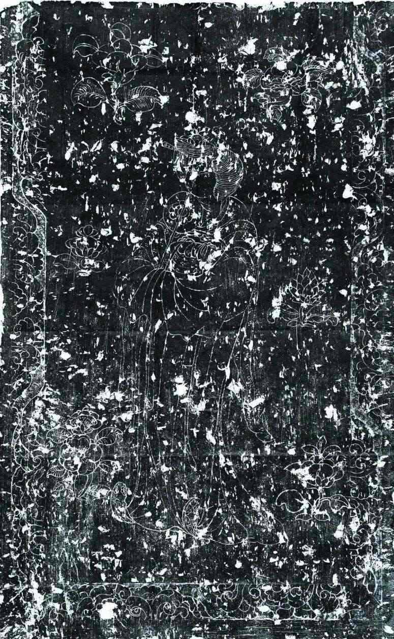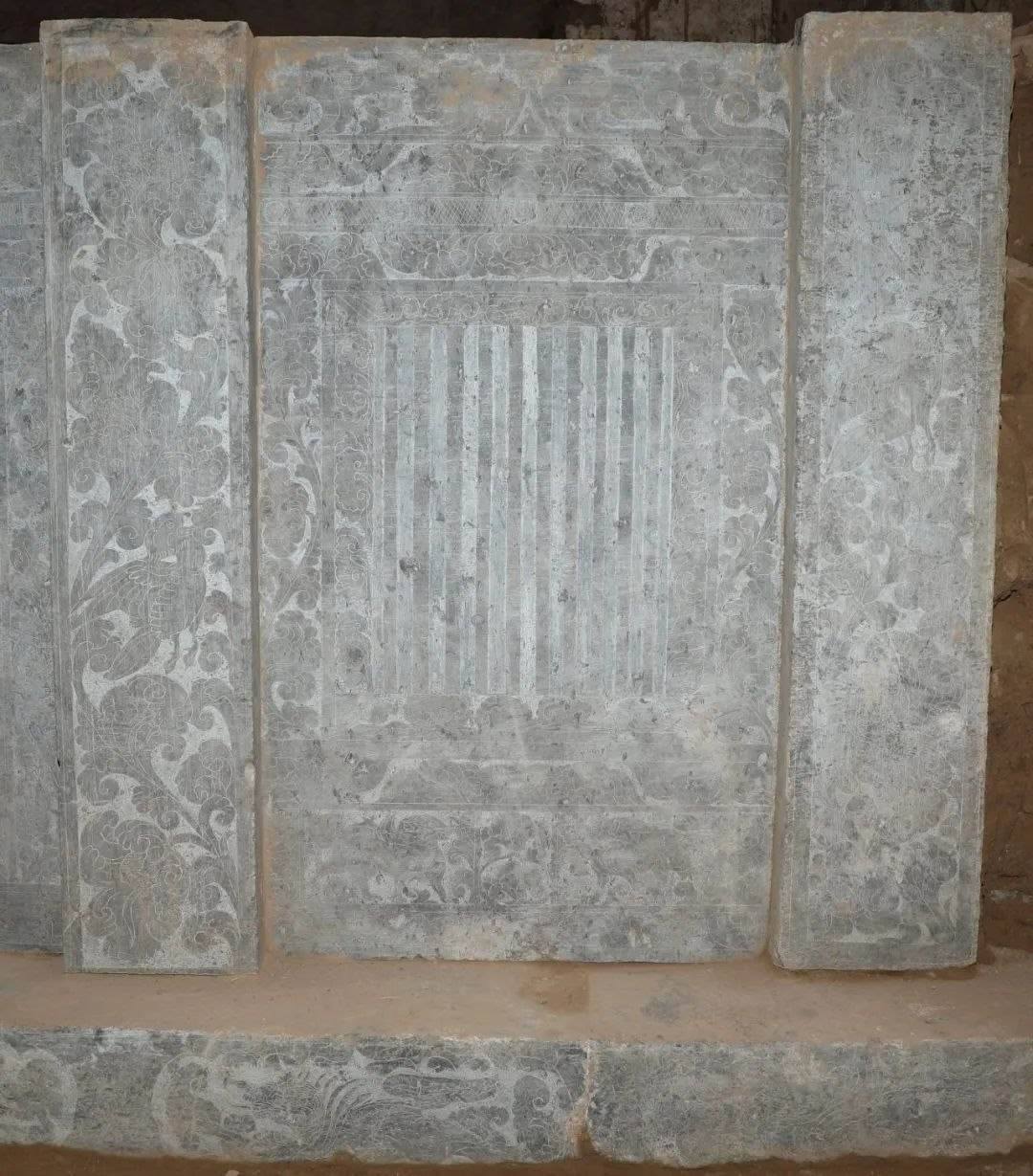 墓室西側(cè)發(fā)現(xiàn)石槨一具,保存較好。石槨面闊三間,進(jìn)深兩間,頂部為廡殿式,僅一側(cè)雕刻有瓦棱;槨身由壁板和倚柱卯和而成,板壁外側(cè)雕刻門窗、卷云及神獸,內(nèi)側(cè)主體為侍女,周邊飾有花草等內(nèi)容;倚柱內(nèi)外均刻纏枝卷草花朵,部分穿插飛禽走獸;基座以七塊石板鋪成,立面間隔刻有壸門圖案,內(nèi)填奔獸圖樣。石槨線刻精細(xì),畫面華麗而不繁縟,人物體態(tài)豐腴而不臃腫,充分體現(xiàn)出盛唐開元時期圖案靈動、富于想象的特征。