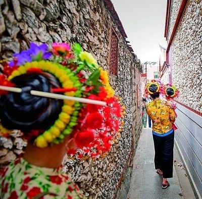 “我們?nèi)粘K鞯摹⒒▏^飾,被稱為‘頭頂上的流動花園’,既是中國古代婦女裝飾的遺風(fēng),也蘊藏著中西方交融的海絲文化?!毕y埔村香香姐簪花圍體驗館的店長黃秀端告訴記者。來自江西贛州的游客王金蓮剛做完簪花,正在對鏡自拍,欣賞自己的“新面孔”。“早就想來蟳埔村‘美一美’,來了以后發(fā)現(xiàn)這里的簪花果真名不虛傳?!痹谒劾?,不只是簪花,蟳埔村的每一個角落都有一種令人難以忘懷的美。