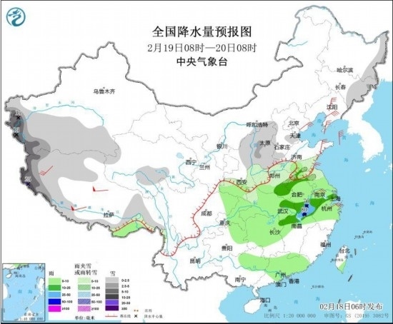 2月20日8時(shí)至21日8時(shí),內(nèi)蒙古中西部、新疆南部、青藏高原大部、西北地區(qū)東部、華北、黃淮等地部分地區(qū)有小到中雪或雨夾雪,其中,陜西南部、華北南部、黃淮中西部、湖北北部等地部分地區(qū)有大到暴雪(10~18毫米)。江淮大部、江漢東部、江南北部、重慶東北部等地部分地區(qū)有中到大雨,局地有暴雨(50~85毫米)。內(nèi)蒙古西部、陜西北部、遼東半島、山東半島、江蘇南部、浙江中部等地部分地區(qū)有4~6級(jí)風(fēng)。渤海、黃海大部海域有7~8級(jí)風(fēng),陣風(fēng)9級(jí)。