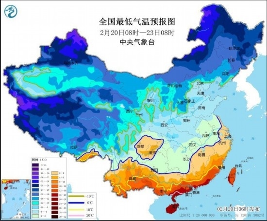 中新網(wǎng)2月20日電 據(jù)中央氣象臺(tái)網(wǎng)站消息,中央氣象臺(tái)2月20日6時(shí)繼續(xù)發(fā)布寒潮橙色預(yù)警:受寒潮影響,預(yù)計(jì),2月20日至2月23日,我國中東部大部將自北向南先后出現(xiàn)降溫,日平均或最低氣溫普遍下降8~12℃,華北南部、黃淮西部、江淮、江漢、江南、華南中北部及貴州等地氣溫將下降12~18℃,其中,湖南南部、貴州東部、廣西北部等地的部分地區(qū)累計(jì)降溫幅度可達(dá)20℃以上。2月23日前后,最低溫度0℃線將南壓到蘇皖南部至湖南南部、貴州南部一帶。