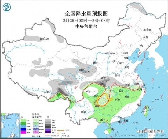 2月25日8時(shí)至26日8時(shí),新疆伊犁河谷和北疆東北部、黑龍江西北部、西藏東部、川西高原北部、青海東部、西北地區(qū)東部、黃淮西部、安徽中南部、江漢、江南西部、貴州東部等地的部分地區(qū)有小到中雪或雨夾雪,其中西藏東部、陜西南部等地的部分地區(qū)有大到暴雪。江漢東部、江南大部、西南地區(qū)東部、華南中西部、云南西北部等地的部分地區(qū)有小到中雨。內(nèi)蒙古中東部、遼東半島、山東半島、浙江東部、廣西南部沿海等地的部分地區(qū)有4~6級(jí)風(fēng),其中川西高原北部等地的部分地區(qū)風(fēng)力可達(dá)7級(jí)以上。黃海南部、東海北部、臺(tái)灣海峽、南海東北部海域有5~7級(jí)、陣風(fēng)8級(jí)的偏北風(fēng)。