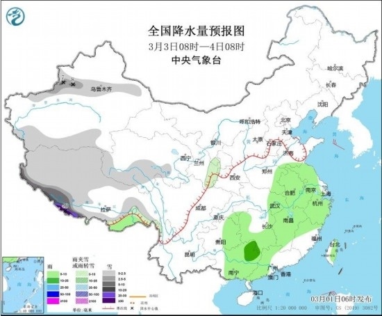 3月3日08時(shí)至4日08時(shí),新疆伊犁河谷、西藏南部和西部等地部分地區(qū)有中到大雪,其中,西藏南部部分地區(qū)有暴雪到大暴雪,局地特大暴雪(30~40毫米)。黃淮西部、江淮、江漢東部、江南大部、西南地區(qū)東南部、華南大部等地部分地區(qū)有小到中雨。
