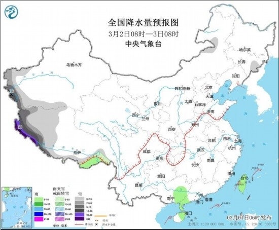 全國(guó)降水量預(yù)報(bào)圖(3月2日08時(shí)-3日08時(shí))