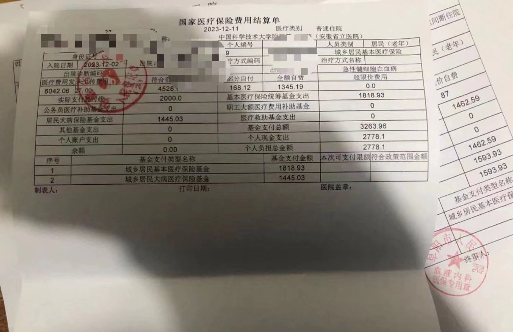 2023年秋季,她老公患上急性髓細(xì)胞白血病,后在合肥市某醫(yī)院治療,住院費(fèi)共花費(fèi)近10萬(wàn)元,而自己僅交了2萬(wàn)多元。