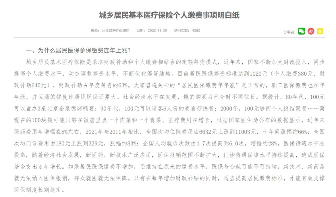 記者注意到,河北省醫(yī)保局去年11月份曾發(fā)布《城鄉(xiāng)居民基本醫(yī)療保險(xiǎn)個(gè)人繳費(fèi)事項(xiàng)明白紙》,其中就“為什么居民醫(yī)保參保繳費(fèi)連年上漲?”問(wèn)題回應(yīng)稱(chēng):“大家普遍關(guān)心的‘居民醫(yī)保繳費(fèi)年年漲’是正常的,職工醫(yī)保繳費(fèi)也在年年漲,并且漲的幅度比居民醫(yī)保還要大。社會(huì)經(jīng)濟(jì)水平在發(fā)展,錢(qián)的購(gòu)買(mǎi)力已今時(shí)不同往日,醫(yī)療費(fèi)用在增長(zhǎng),醫(yī)保待遇水平在提高。如果居民醫(yī)保繳費(fèi)不增加,還維持在原來(lái)的繳費(fèi)水平,醫(yī)?;鹁涂赡懿豢沙掷m(xù),新技術(shù)、新藥品就無(wú)法納入醫(yī)保報(bào)銷(xiāo),群眾就醫(yī)就無(wú)法保障?!?/p>