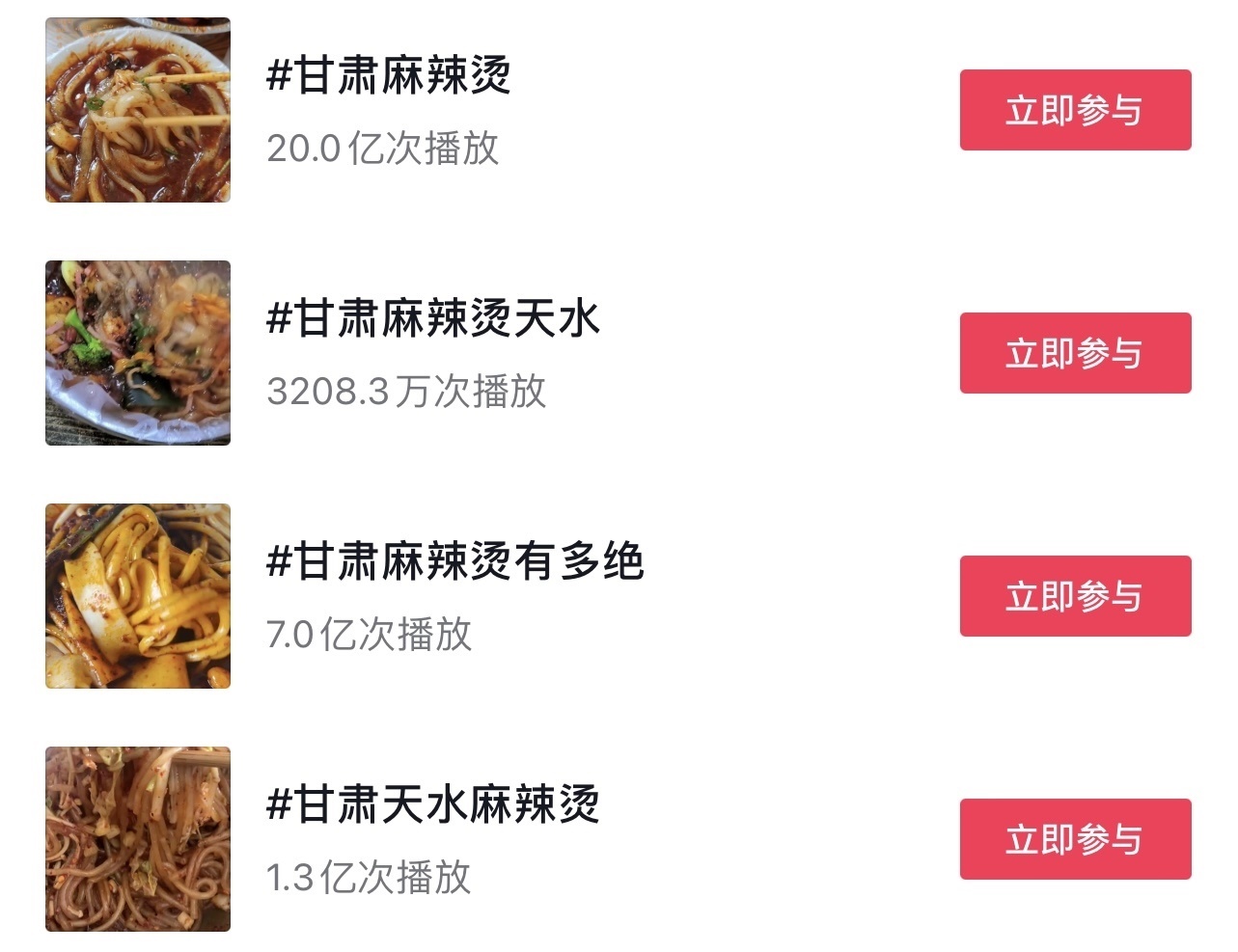 “這兩條視頻吸引了大量網(wǎng)民觀看、點(diǎn)贊、轉(zhuǎn)發(fā),之后陸續(xù)有網(wǎng)民發(fā)布相關(guān)視頻?!?月18日,甘肅省文化和旅游廳在回復(fù)網(wǎng)友建議中提到,3月份以來(lái),“甘肅麻辣燙”話(huà)題迅速發(fā)酵,視頻內(nèi)容迅速增加,多次登上抖音、快手等短視頻平臺(tái)熱榜。截至3月16日18:00,各大短視頻平臺(tái)上“甘肅麻辣燙”相關(guān)話(huà)題累計(jì)播放量已超過(guò)32.6億次。