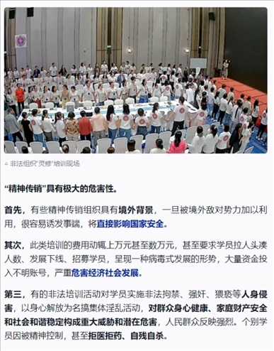 ·起底被公安機(jī)關(guān)打擊查處的“靈修”組織:打著“靈修”“靈魂塑造”等旗號,對學(xué)員實(shí)施精神控制;借“靈修”提升之名,行“精神傳銷”之實(shí)。鄧海鵬及其創(chuàng)辦的培訓(xùn)機(jī)構(gòu),打著“靈魂塑造”“集體場域”的幌子,對學(xué)員進(jìn)行精神控制,然后以傳銷、加盟、進(jìn)階等現(xiàn)代營銷模式達(dá)到斂財(cái)漁色目的。人前他要求學(xué)員全部吃素,自己每天大魚大肉,必吃海參;人前他要求學(xué)員不能有不動(dòng)產(chǎn)、錢是修行來的,自己卻拿著騙來的錢去買理財(cái)產(chǎn)品;人前他無兒無女,實(shí)則有妻有女;人前假裝不近女色,背地里卻漁色女學(xué)員。