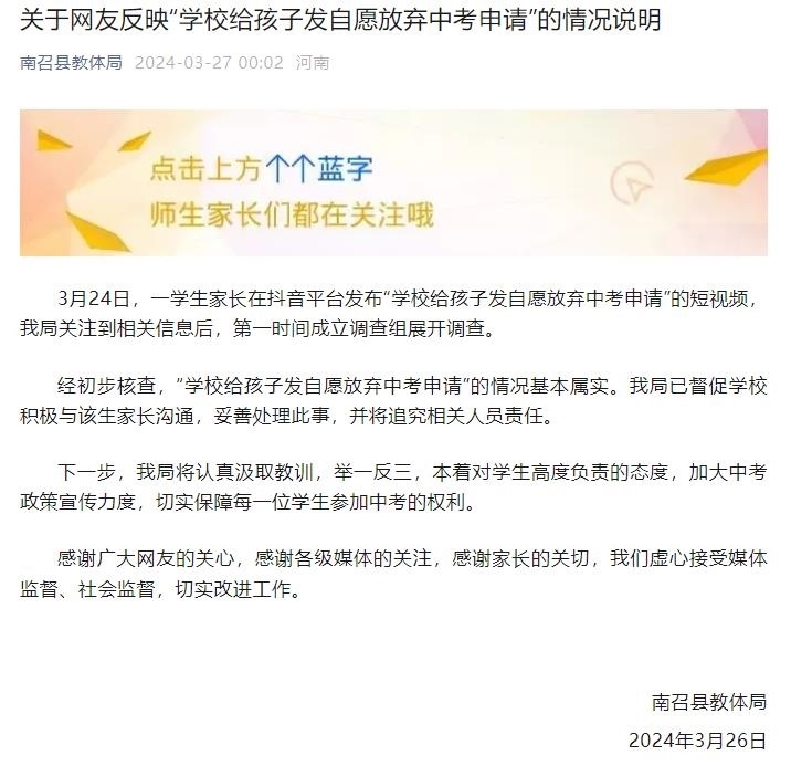 說明稱,3月24日,一學生家長在抖音平臺發(fā)布“學校給孩子發(fā)自愿放棄中考申請”的短視頻,該局關注到相關信息后,第一時間成立調查組展開調查。