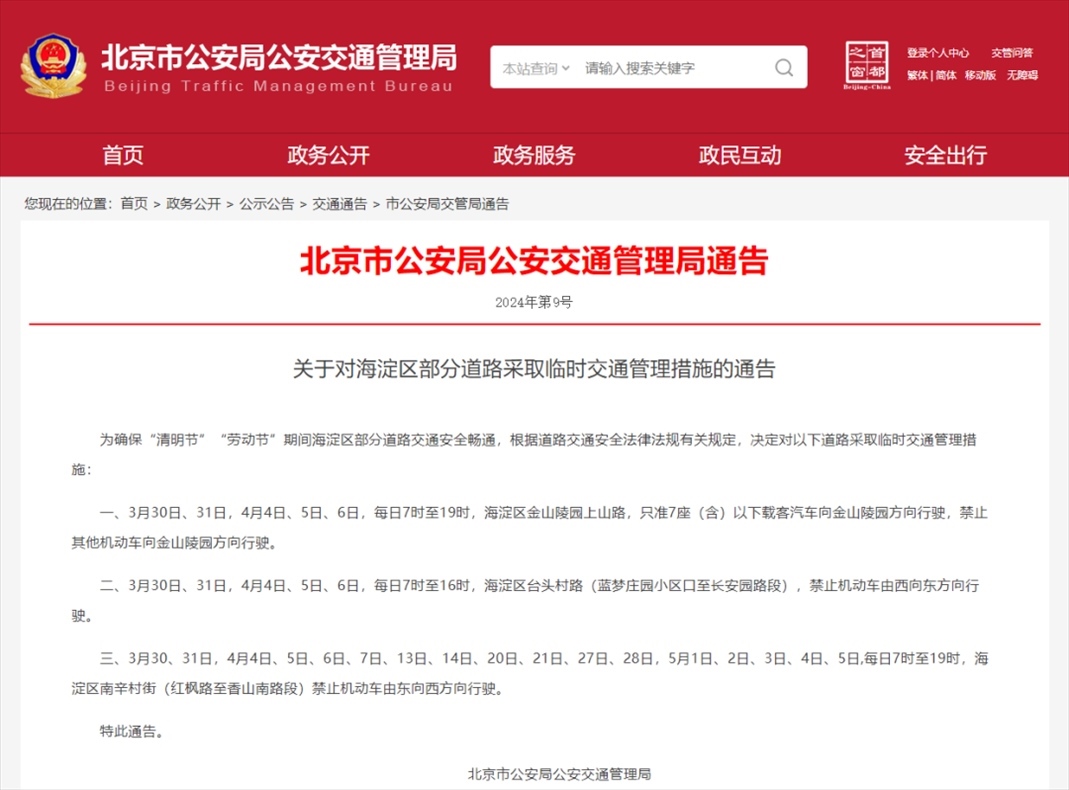央視網(wǎng)消息:據(jù)北京市公安局公安交通管理局消息,3月26日,北京市交管局網(wǎng)站發(fā)布《關(guān)于對海淀區(qū)部分道路采取臨時(shí)交通管理措施的通告》,為確?!扒迕鞴?jié)”“勞動(dòng)節(jié)”期間海淀區(qū)部分道路交通安全暢通,根據(jù)道路交通安全法律法規(guī)有關(guān)規(guī)定,決定對以下道路采取臨時(shí)交通管理措施。