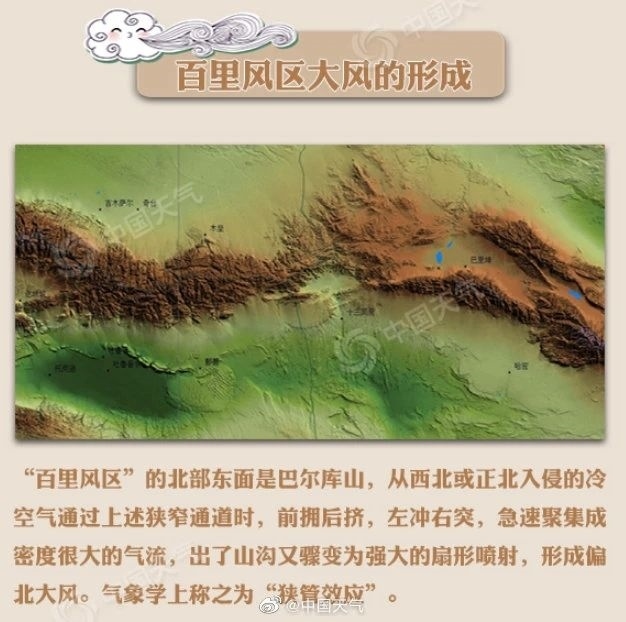 “百里風(fēng)區(qū)”的北部東面是巴爾庫(kù)山,從冷空氣通過(guò)上述狹窄通道時(shí),前擁后擠,左沖右突,急速聚集成密度很大的氣流,出了山溝又驟變?yōu)閺?qiáng)大的扇形噴射。