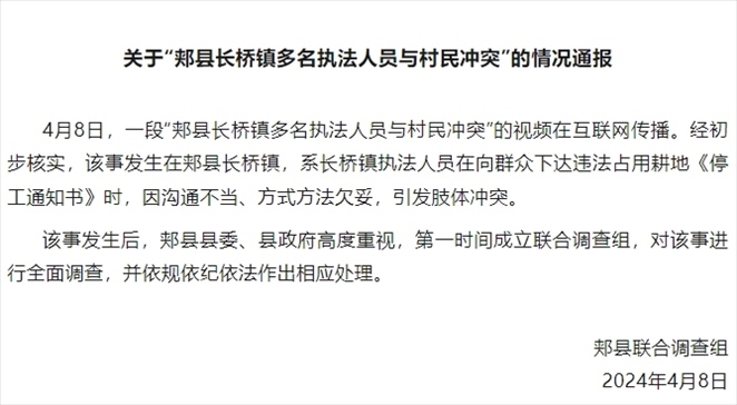 ·河南郟縣通報“多名執(zhí)法人員與村民發(fā)生沖突”:成立聯合調查組。