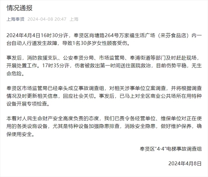 ·身體被卷入扶梯女子面臨截肢風險,屬地政府及街道辦等部門均已介入。上海奉賢通報稱成立事故調查組。