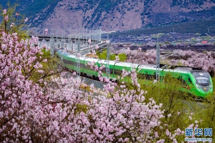 雪域高原桃花開,復興號上賞春光。拉林鐵路的車票,猶如一張賞花請柬,吸引了眾多游客前來雪域高原賞桃花。