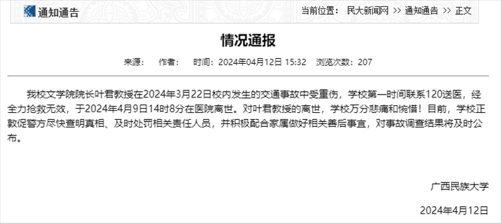 央視網(wǎng)消息:據(jù)廣西民族大學(xué)網(wǎng)站消息,廣西民族大學(xué)4月12日發(fā)布情況通報,該校文學(xué)院院長葉君教授在2024年3月22日校內(nèi)發(fā)生的交通事故中受重傷,學(xué)校第一時間聯(lián)系120送醫(yī),經(jīng)全力搶救無效,于2024年4月9日14時8分在醫(yī)院離世。對葉君教授的離世,學(xué)校萬分悲痛和惋惜!目前,學(xué)校正敦促警方盡快查明真相、及時處罰相關(guān)責任人員,并積極配合家屬做好相關(guān)善后事宜,對事故調(diào)查結(jié)果將及時公布。