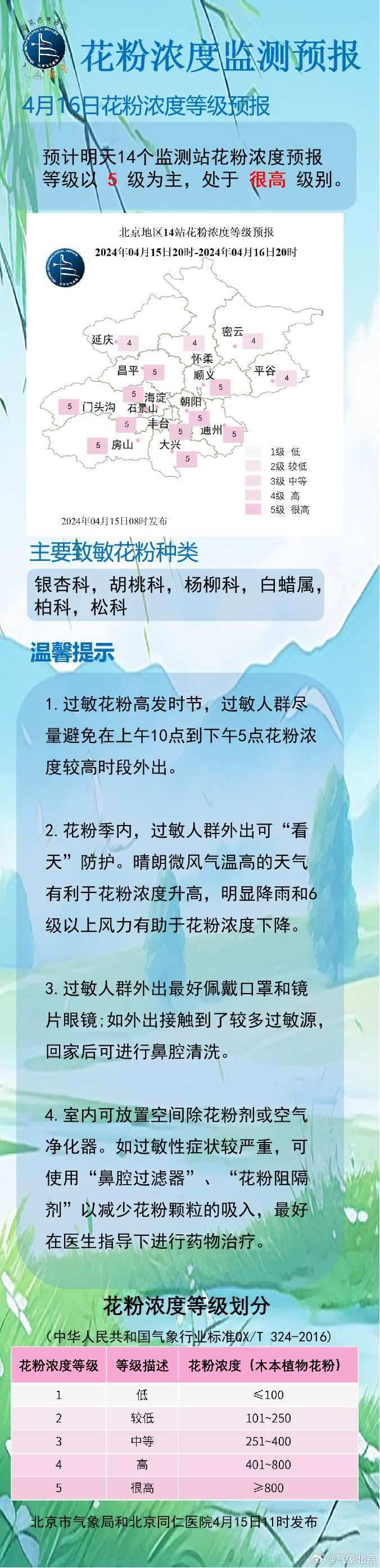 央視網(wǎng)消息:@?氣象北京 發(fā)布花粉實(shí)況及花粉濃度預(yù)報(bào),昨日(4月14日)北京6站大部花粉濃度等級(jí)為4級(jí)。目前本市主要致敏花粉種類(lèi)為銀杏科、胡桃科、楊柳科,白蠟屬,柏科,松科等。預(yù)計(jì)4月15日14站花粉濃度以5級(jí)為主,為很高級(jí)別(>800)。今天有大風(fēng)沙塵天氣,大部分地區(qū)花粉濃度為很高級(jí)別,敏感人群外出需注意做好健康防護(hù)。