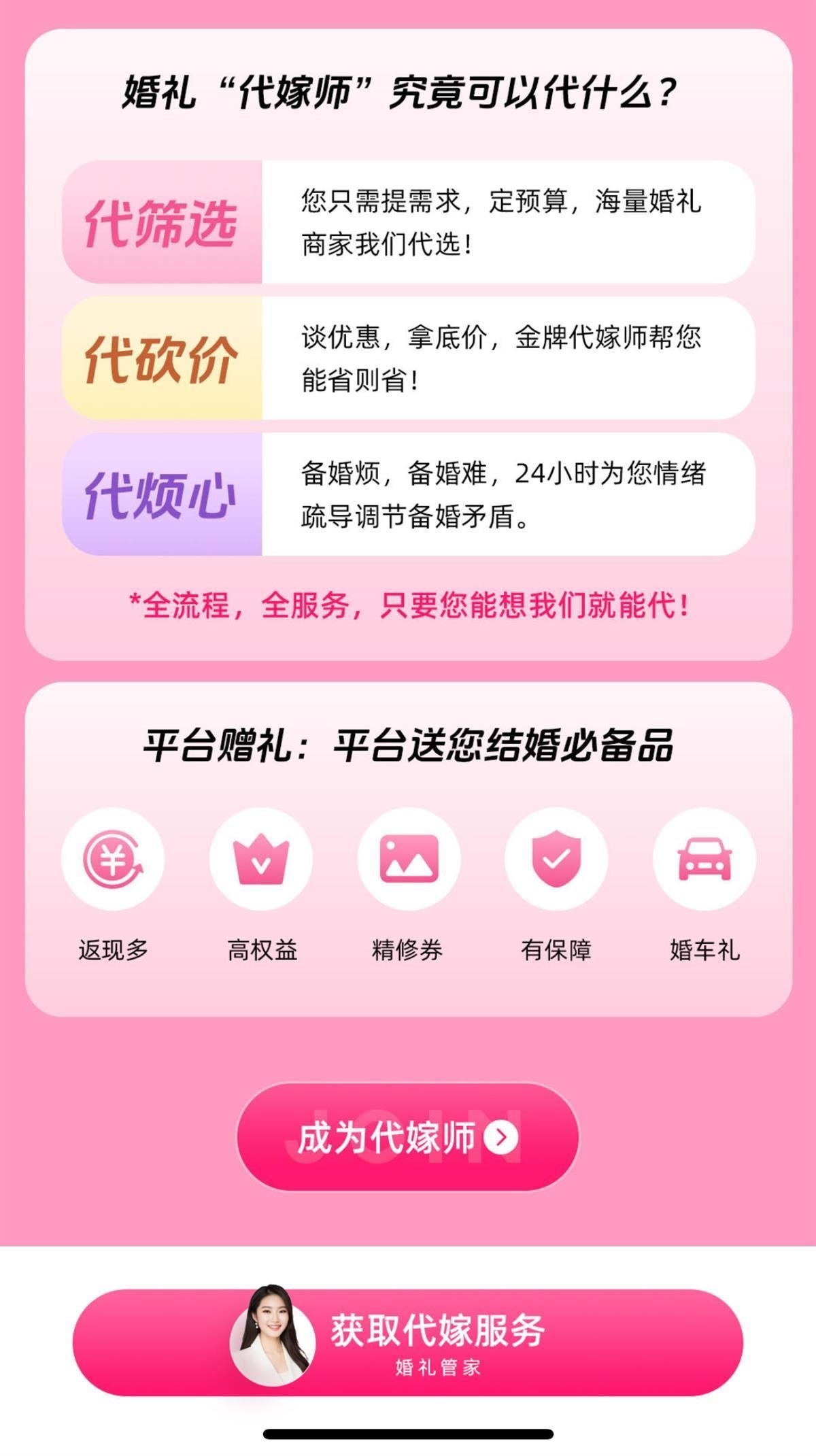 該頁面還宣傳稱,代嫁師可以“代篩選”“代砍價”“代煩心”,并且還有一行字強調:“全流程,全服務,只要您能想,代嫁師就能代?!?/p>