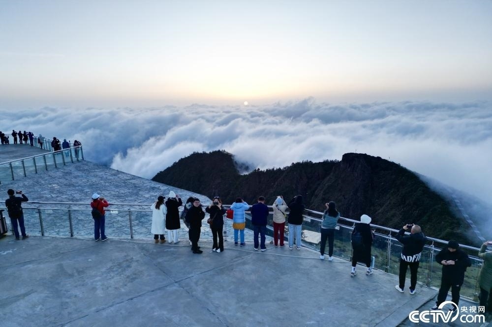 四川雅安,牛背山雨后放晴,游客站在觀景平臺(tái)上欣賞“日出云?!本坝^。
