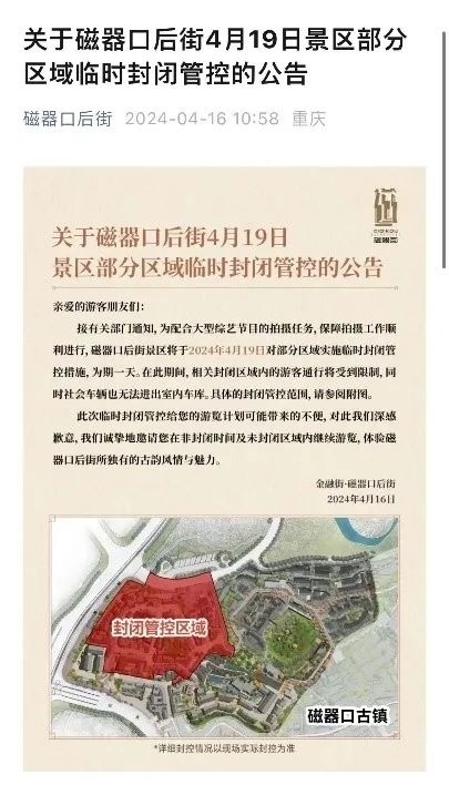 根據(jù)磁器口后街景區(qū)發(fā)布的公告,為配合大型綜藝節(jié)目的拍攝任務(wù),保障拍攝工作順利進(jìn)行,磁器口后街景區(qū)于4月19日對部分區(qū)域?qū)嵤┡R時封閉管控措施,為期一天。該景區(qū)后續(xù)發(fā)布視頻也顯示,當(dāng)天確實為綜藝節(jié)目《奔跑吧》借地錄制。