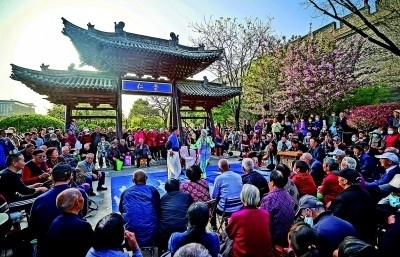 眾多市民圍觀欣賞秦腔愛(ài)好者的表演。