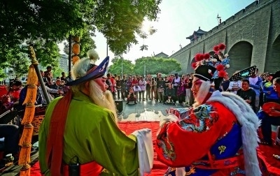 在西安文昌門外,秦腔愛(ài)好者表演秦腔折子戲《蘇武牧羊》。