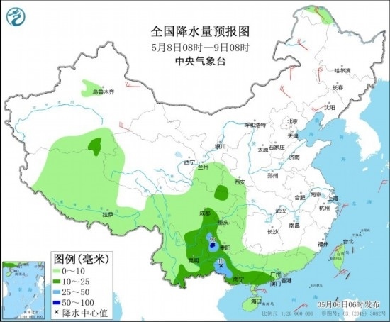 全國降水量預(yù)報(bào)圖(5月8日08時(shí)-9日08時(shí))