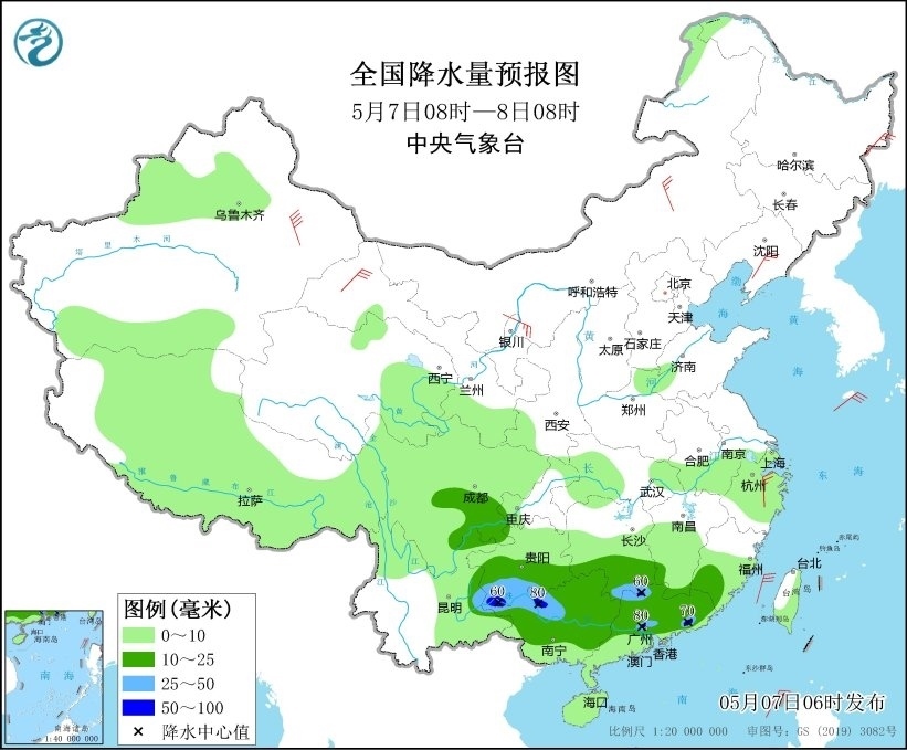 人民網(wǎng)北京5月7日電 (溫璐、高清揚)據(jù)中央氣象臺網(wǎng)站消息,昨日,廣西中南部、廣東中西部、海南島中部及貴州中北部、云南東南部等地部分地區(qū)出現(xiàn)大到暴雨,廣西玉林,廣東肇慶、佛山、清遠,海南白沙,貴州黔南州、畢節(jié)等局地大暴雨。預(yù)計未來三天,南方降雨呈現(xiàn)西強東弱的趨勢,江南、華南等地降雨有所減弱,轉(zhuǎn)為陰雨天氣,西南地區(qū)降雨增多,四川盆地南部、云南中部和東部、貴州西部和南部等地有中到大雨,局地暴雨。