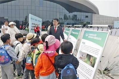玉環(huán)法院綜合審判庭干警在漩門(mén)灣國(guó)家濕地公園,向小學(xué)生講解普法展板。