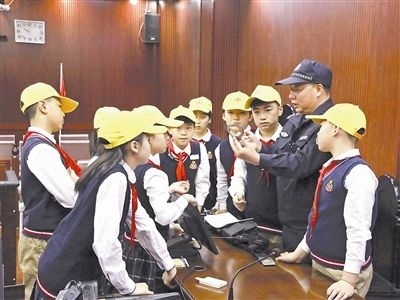 近日,河南省商丘市中級人民法院開設了一堂法治課,為十余名尋訪研學的學生實地講授法律知識。研學活動中,在法治副校長和法警的帶領下,同學們依次參觀了審判庭、羈押室、少年審判庭等場所,了解了法庭布置,體驗了單警裝備,學到了法律知識,“零距離”感受到了法律的崇高與神圣。圖為法警向同學們展示手銬。