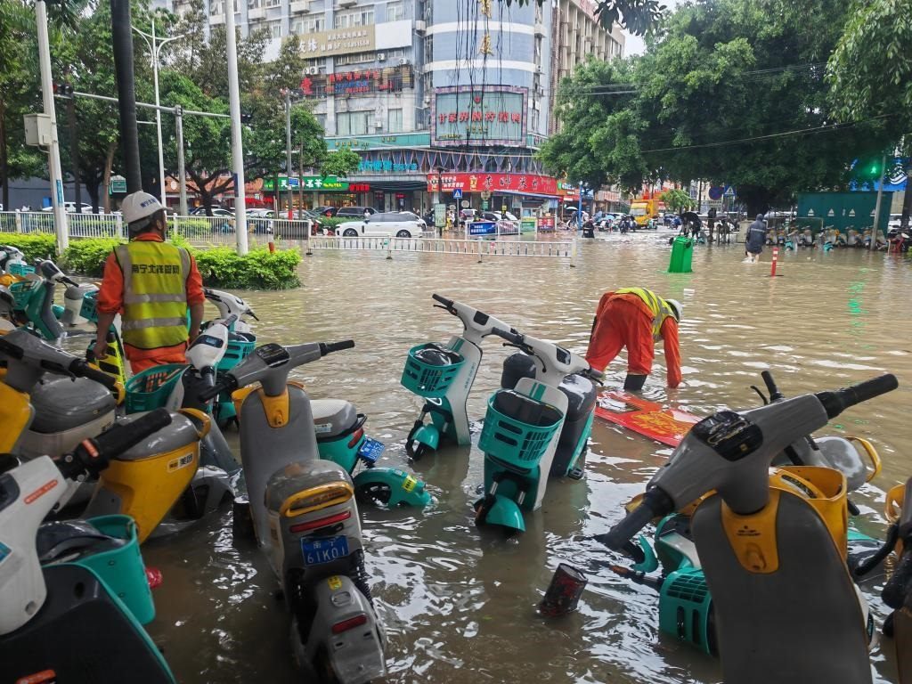 受暴雨影響,南寧市部分城區(qū)發(fā)生內(nèi)澇,一些低洼地帶積水較深。記者在南寧市青秀區(qū)東葛路一帶看到,一些地方積水深度為0.5米左右,不少電動(dòng)自行車側(cè)倒在馬路兩邊,有數(shù)輛小汽車熄火停在路中間。一名群眾告訴記者,19日凌晨3時(shí)左右突降暴雨,大量雨水灌入地勢(shì)較低的地下車庫(kù),一些來(lái)不及轉(zhuǎn)移的車輛被淹。