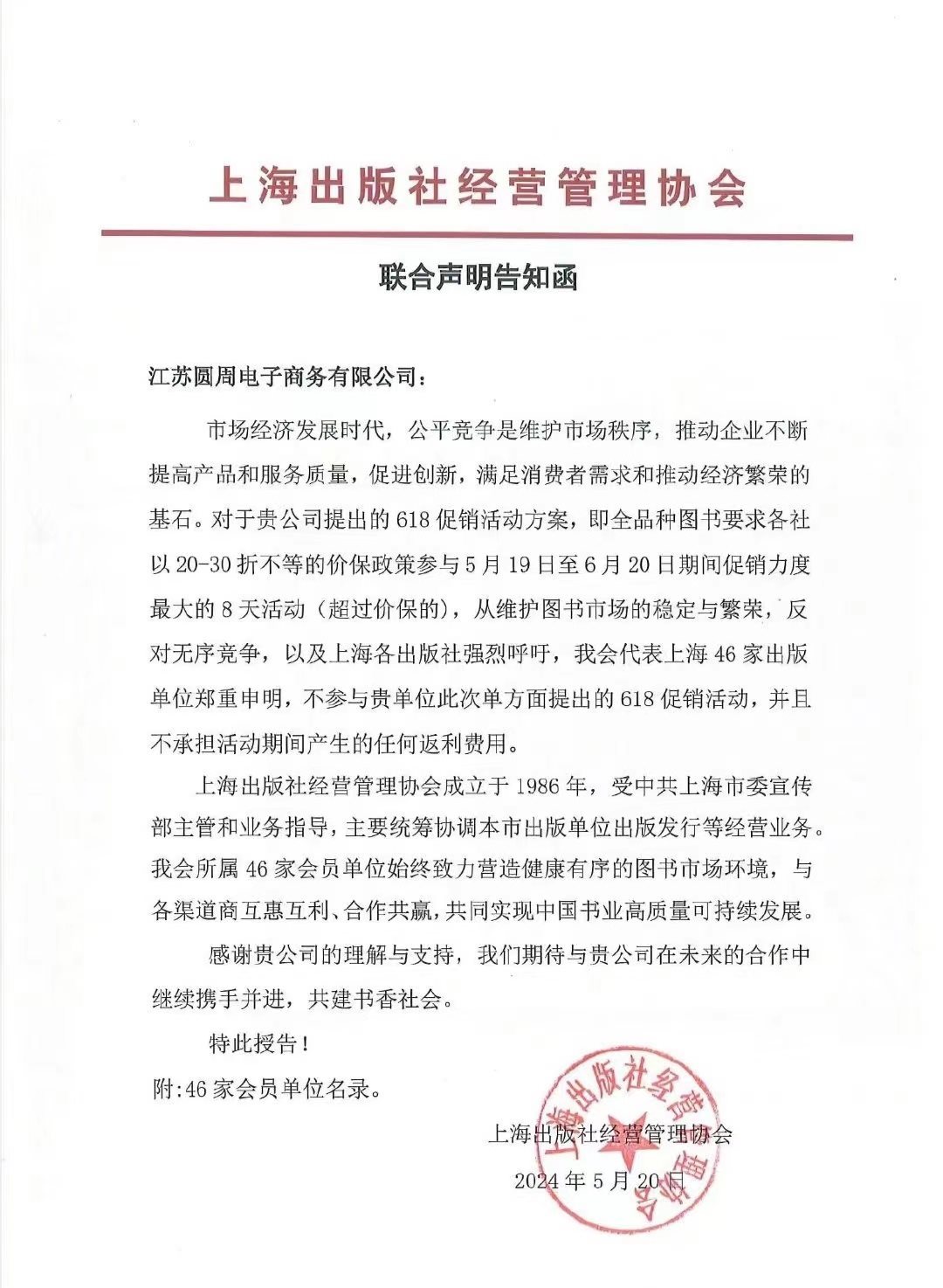 上海的46家出版社以上海出版社經(jīng)營管理協(xié)會的名義聯(lián)合聲明退出京東618促銷
