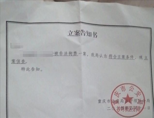 事發(fā)后,家屬向當(dāng)?shù)嘏沙鏊鶊蟀?。王先生出示的立案告知書顯示,5月11日,重慶市公安局沙坪壩區(qū)分局對前文中的夫妻倆被非法拘禁一案立案偵查。